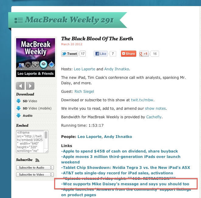 Have to call out one of my favorite podcasts. Went on vacation for a few weeks. Didn’t take anything that would allow me to connect to the Internets like I do on a daily basis while not on vacation. Vacation is vacation, right? (But I did take my Kindle and read like a madman!) When vacation was over, there was a nerve or two commanding me to get back online. There is an effect of not having heard any tech news for two weeks. But let me backtrack for a sec. Just as I was leaving for vacation Mike Daisey was in the news and being called-out for not being a journalist. That didn’t surprise me. Heck, I even downloaded the text to his one-man show onto my Kindle (but didn’t get to reading it while on vacation). Sun, fun, scuba was just ahead of me. So. Back to the present. When I heard the podcast from my favorite Macintosh show, from the twit-network, I went through the roof. I couldn’t believe what I was hearing. The red box in the pic above in no way indicates how it was attempted to completely disqualify Mike Daisey’s criticism. It was Andy Ihnatko that did most of the batshit talk, defacing Daisey’s work. I guess I’m disappointed in that – but somehow not surprised. Being complicit is a hard pill to swallow.