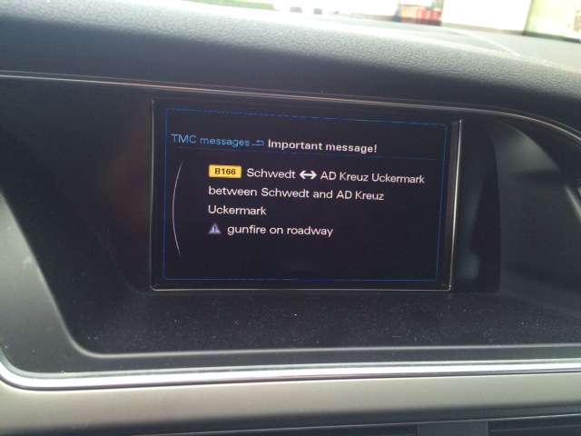 There are moments worth standing up for, embracing, putting on a history list. Even when one is sitting comfortably in her/his Audi A4 AllRoad. Btw. Have I mentioned how über-expensive Audi is? I mean, when you consider that VW is the basis for this car and that the two are equally stalled in the world of car development and the confusion of plastic and über-plastic and the fact that without both Porsche would probably fold up like the tongue of a fresh ninety-year old corpse left without burial… Or maybe not. Ok. Enough of my worst-writing about made in Germany cars. And I admit my Audi does drive pretty good. Although I wouldn’t recommend the AllRoad if you want a smooth ride. It’s a bit rough compared to the standard A4 Quattro–especially at higher speeds. The supercharged transmission that comes with the unter-charged turbo diesel V6 also makes the car feel like a tractor more than it should. Even though the car has four drive settings, i.e. comfy, economic, dynamic and whore-rant, not one smooths out the rough and vulgar transmission. In low gears at low speeds you can feel every gear change. And that fly-by-wire steering doesn’t make things better either. Of course there’s much to be worst-said about the tech-specs of this car, of which there are numerous, but I won’t bore you with them now. Because I want to mention how poorly the multi-media-interface works with iPhones. Even though the navigation system cost us two arms and three legs I rarely use it because it just doesn’t compare with how well Google Maps or Apple Maps works on my iPhone. I don’t use any of the music system because, well, it works like krapp–or like Windows95. Of course the dealer says that an update would improve the MMI and navigation system but then tells you how much such an update will cost. Oh well. So much for buying something that no one can or should afford–unless they have money to burn. It’s just that I don’t like burning it. And so we all make our sacrifices. What are yours? With that in mind, allow me to move on to the gist of this worst-post. Most modern German cars don’t seem to have enough wasted technology that bores the krapp out of owners. In fact, there’s so much tech-krapp in my Audi that I’ve found the ultimate solution for using it: DON’T USE IT. Seriously. As much as I can I do only one thing and one thing only with my Audi. I drive it. After I drive I park it. Then I forget it. So. The other day my better-half sent me this pic and I kinda freaked out. A message was sent out on the German TMC system and our car radio received it. I’m so glad she was able to take a pic of it, too. Btw, TMC stands for traffic message channel. TMC is typical waste-of-time technology that #Germania is full of, especially when it comes to cars. The idear is that you can send digital data over standard radio frequencies. Like most technology, though, greed is inherently attached to it so the cost of implementing it always prohibits it’s usefulness. First, even if it works, who is gonna pay the cost of the content? Second, what content should be sent on it? Obviously TMC could be a great method of informing drivers about traffic. But it’s been around for (insert # here) of years and I can’t remember the last time I saw something on it that was useful. Again. Technology can be great but not when it’s in the hands of those who are clueless–like the engineers at Audi. They know how to make a cars but they are ignorant to the bells & whistles. But I’m worst-rambling again. Nomatter. The B166 is a short highway east of Berlin. According to the TMC there was “gunfire” on the road. Process that for a moment. Pacified Germania is turning into the wild west? Now, keep in mind, our Audi’s radio receives the TMC via German radio waves. That’s right. The German’s own radio waves. (Stop laughing.) Radio in Germany is über regulated. Our Audi, at the moment of reception of this message was near Cologne. Where the hell did the message come from? You can’t receive radio from Brandenburg in Cologne. Oh well. This is what happens when technology and engineering is a lifestyle choice, i.e. serves no real purpose. I guess. Rant on. -Tommi