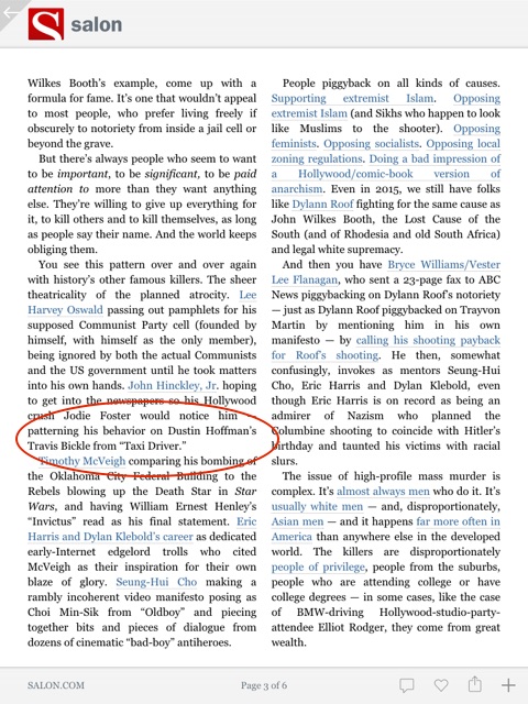 Note on the pic above: this is a screenshot from my iPad4 of the initial post of an article that appeared on salon.com. Clicking on the pic will enlarge it. The author of the article mistakes Dustin Hoffman as the actor in the movie Taxi Driver. An honest mistake–I guess. The post has since been corrected, although the correction is not mentioned. Got that? I wonder what else confuses the author where he feels there’s no need to add a correction notice. But I digress.