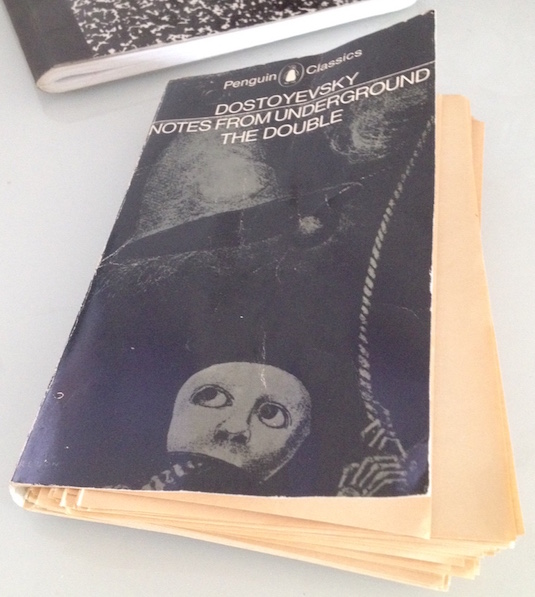Thoughts this morn about Dostoyevsky’s Notes From Underground. I’ve been enjoying the taste, feel and smell of this 1972 paperback for the past few weeks. I think I acquired it while visiting London in 1995. Obviously it’s not dealing with age and dryness but neither am I. Funny thing is, I’ve already gone through three or four rubber-bands to keep it together. Looks like I won’t be reading The Double anytime soon. Oh well.