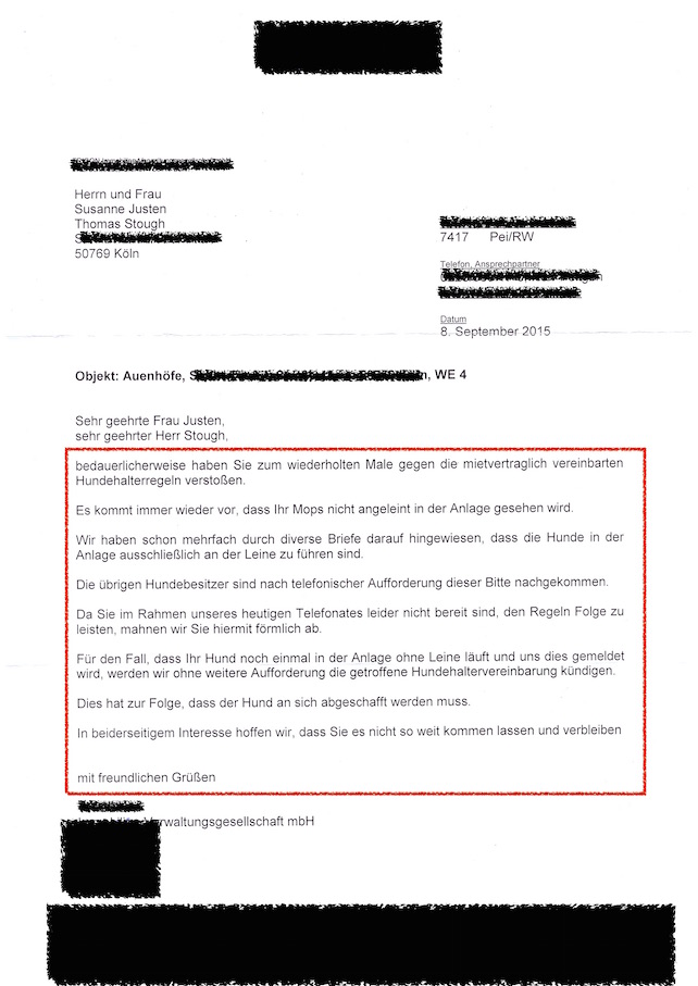 The letter we received has since been retracted and we also have received a formal apology from the property administrator. Yet I feel somewhat inconsolable regarding the threatening nature of the whole situation. This goes beyond facts not being checked, contracts not being read, the potential for legal fees and horrific bureaucracy. Not only were we threatened about the livelihood of our dog but were indirectly threatened by the fact that dogs in Germany are regularly poisoned because of situations just like this. I find that type of dialogue in this situation very, very disturbing!