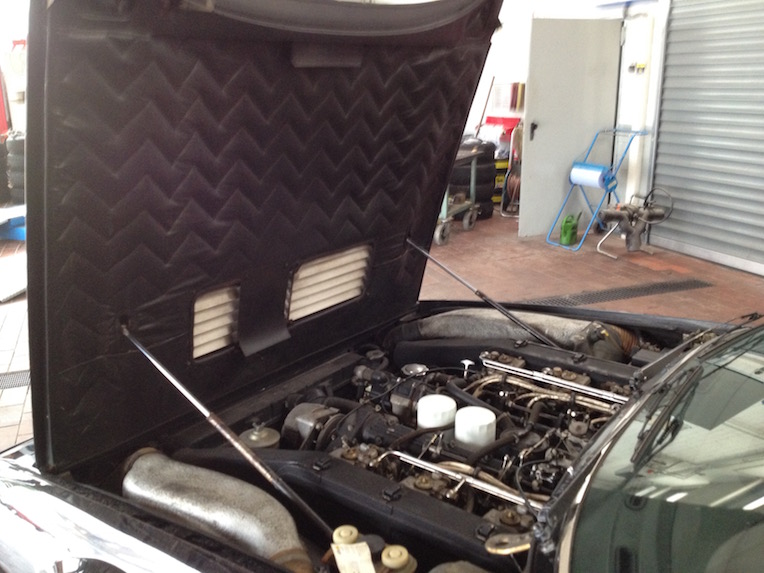 Under the hood of a really, really cool Ferrari 400 Automatic. Sorry for the blurry photography.Had to get a few minor adjustments to my Alfa yesterday. Recently had four new Pirellis installed (and boy are they better than the cheap tyres I had on her before). Also, finally had passenger window repaired. After I repaired it the first time it went bust I thought it better to let a professional handle it this time. Besides, I drove her around this summer and had to use a strong rubber grip in order to get the window up and down. Also went ahead and had a switch installed next to the battery (in the boot) that allows me to simply disconnect the battery when I put her in the garage over winter. And be assured, winter is coming to Colonia sooner than anybody thinks. Hopefully the days of having to replace the battery every frickin’ spring are over (the analogue clock under the dashboard doesnt help either). I also turned in some old extra wide rims that came with the Alfa when we bought her from some dude in Munich about ten years ago. Those wheels, although they looked good, didn’t play well with the rear-end axel mounts. The extra width caused the mounts to over strain when turning. Luckily I was able to find some used, in great condition, original alu Spider wheels on the Interwebnet. But that’s not what I wanted to worst-write about today, dear worst-reader. Today we’re gonna post about what we saw at my favourite Alfa garage. Every time I go there there is some form of Italian super car waiting in the wings. The lead mechanic of the place is some kind of guru Ferrari specialist. At the least when you greet him he doesn’t greet you back–and that seems fitting. And the guy who owns the garage is obsessed with Italian cars all the same. The showroom is always full of 60s and 70s Giulias and GTAs and, of course, my beloved Spiders. Again. Anywho. Although I’m not much of Ferrari fan, I have to admit whenever one is parked in the garage I have a quick look. That said, there was a real treat in the garage yesterday. A Ferrari 400 Automatic. I had never seen one up-close. It’s a two-door sedan that for some ungodly reason the Italians thought they should build in order to satisfy the needs of ageing Ferrari nuts who wanted a vehicle to take a party of four to the opera. In fact, after gawking at the luscious interior I couldn’t take my eyes off the engine: 4.8 litre, 12 cylinder, six carburettors. But eventually I did take my eyes off it only to stare for a few moments at the material that lines the inside of the hood. What the hell is that, I thought after poking at it with my left index finger. I couldn’t believe how thick and stable it was. It felt more like a thick, leather pillow that the engine could rest on–if the car were turned up-side-down. But then I thought of those films where a killer approaches his sleeping victim in the middle of the night. The killer grabs a thick pillow and puts it over the muzzle of his gun. He then fires and we see the legs or perhaps a hand jolt with a last signal of life. Then we see the black stained pillow in the after math of unleashed death. Blood seeps out from somewhere underneath it. Yeah. That’s what I thought about while touching the noise reducing material under the hood of an absolutely gorgeous Ferrari. Rant on. -tommi