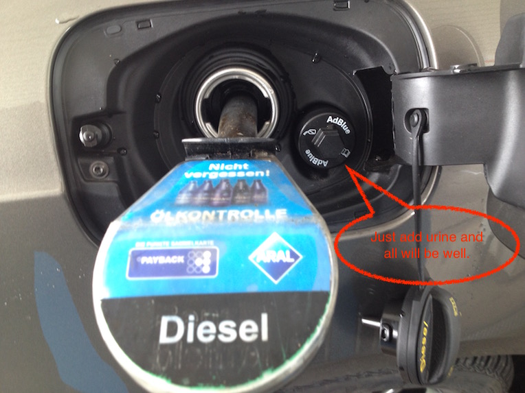 Well, dear worst-reader, so much for jokesters and hamsters. As I tried to say here, it would be fun if car makers–especially those who lie to us about emissions–had a sense of humour. But then again, how can one have a sense of humour when you know that society can do nothing to you for your crimes? Or maybe that’s a reason to have a sense of humour? Nomatter. This worst-post is just a follow-up to my post about VW, the lie of emissions and what probably should be my last diesel powered car. And as I also worst-said, I ordered what should be my last diesel last spring, even though I was stunted by the fact that during the car shopping faze, I could have chosen a gasoline (otto motor) powered car. In my confusion I was kinda happy to go ‘head and take one last diesel. Remember, nature is my servant, and there is something über about a 3.0ltr, six cylinder, 240hp, 460 torque motor in a car built on an aluminium chassis with full-time all-wheel drive (quattro). With that in mind, and after driving around in my new Audi, it was time for her first fill-up. And what do I see when I open that little hatch. That’s right, another frickin’ hatch. As you can see in the pic above, I have celebrated too soon regarding my lust for turning nature into my bitch. This new Audi is indeed not the nature trashing beast that my previous Audi was. Yeah, baby. My last Audi (AllRoad)–one of Audi’s worst cars, btw–had only one orifice for filling it’s diesel lust. That single orifice is the reason that VW will pay so few taxes in the coming years. What? What does lying about emissions and orifices have to do with taxes? Well, I’m glad you asked. Recalling cars has become part of the gluttonous way multi-nationals have to run their businesses. Ralf Nader refers to it as recycled tax money. For you see, all these multi-nationals have to do is claim to pay fines and fees whereby they simply make a few changes on their income statements that reflect less revenues and hence fewer profits for whatever given year. Since taxes are rendered based on revenues and profits, they pay less tax. (Short pause. Breath.) I know. I know. I’m trivialising something that is much more complex. But that’s the thing about being worst-writer. I not only can dish out the bullshit but I can cut through it just the same. Oh well. I’m off subject, as usual. Check out the pic above, dear worst-reader. It’s my first tank fill on my new Audi A5. And what do I find? That’s right. There it is. There’s the other orifice that VW hopes to retrofit all of those diesel powered cars that it illegally sold by lying to customers about emissions. All new VW (and Audi) diesels have this extra orifice. They are conveniently labeled “AdBlue”. In this orifice goes a special chemical, about eight gallons of it. Gee, I wonder what PR/Advert company earned millions on figuring out that spiffy name? The technical acronym for this stuff is DEF, which stands for diesel exhaust fluid. But the real world term for it is piss. That’s right dear worst-reader. The main chemical in DEF, which is mixed with diesel exhaust prior to entering the catalytic converter, is urea. The main substance in urea is nitrogen and all mammals produce it in their urine. Urea reduces the emission of nitrogen dioxide in diesel exhaust–which is pretty hazardous stuff. Are we thankful for what these engineers can come up with in our time of need? Do/Can we appreciate their concern about our health and welfare? I mean. Why the hell couldn’t they just make it so that we could piss in our cars? I mean. Seriously. Does profit have to be made on everything? I mean. That’s what having another orifice where something manufactured has to go into is all about. Or? I guess the powers-that-be are so angry that they can’t charge humanity for breathing air means that they then feel no remorse when resorting to the most silly forms of profiteering that coincides with lying about emissions. Indeed. But before you whip out your slick-willy and take gentle aim at that little orifice, heed this: human urine only has between 2-4% urea. DEF has something like 30%. Wow. We pissers can’t get a break. Rant on. -tommi