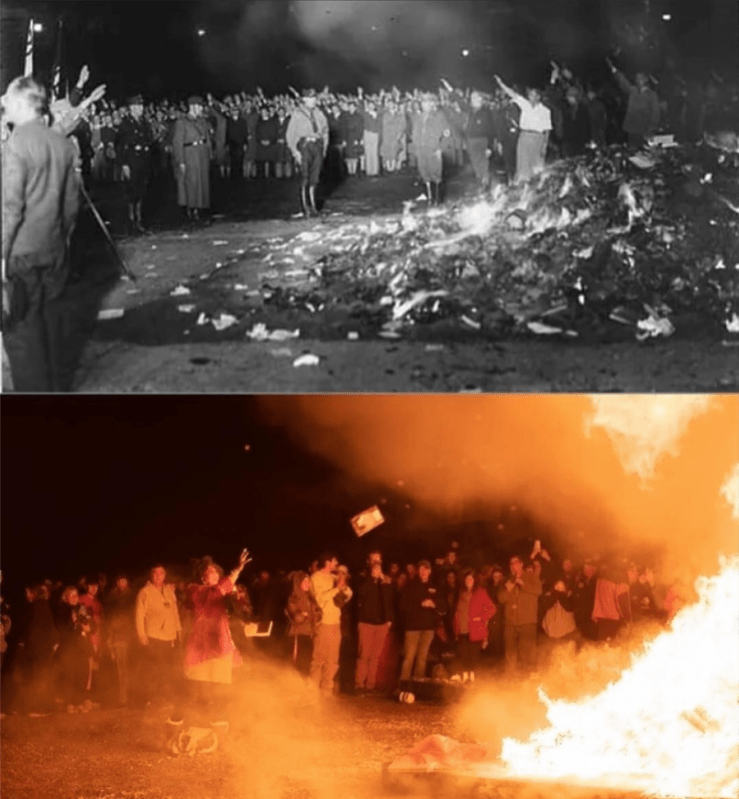 It’s no wonder that a book burning in Redneckville #Americant barely makes any headlines. Hence the somewhat obscure pic above that I found on reddit (see source link below). Will the colour pic, taken only days ago, eventually go down in history as a pic of losers–just like the black&white pic above it? Who can know, eh, dear worst-reader. Just get a load of the people burning books. Which begs another question: who is organising all this nonsense? See article link below.