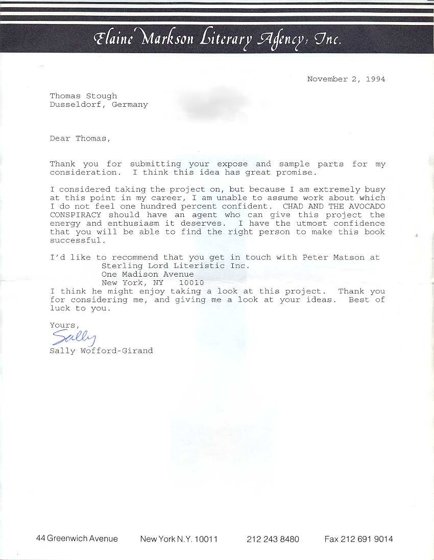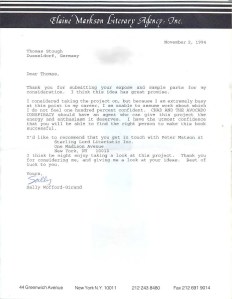 Elaine Markson Literary Agency Rejection Letter Tom December 10, 2006 Now this is a nice rejection letter, don’t you agree? Published December 10, 2006